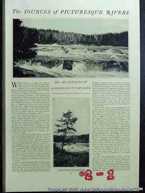 Original vintage magazine article titled, THE SOURCES OF PICTURESQUE RIVERS III - The Saguenay by Reginald T. Townsend, Photographs by Inglis P. Barker and Others. Pictured is the Saguenay River (Quebec Canada) issuing from Lake St. John. Cape Trinity, the climax of scenery on the Saguenay, the town of Chicoutimi, A view inland from the top of Cape Trinity. The rush and swirl of the waters at the head of the Saguenay are in marked contrast to the quite depths of the great fjord farther down near its discharge into the mighty St. Lawrence. Old 1922 article. 3 pages.