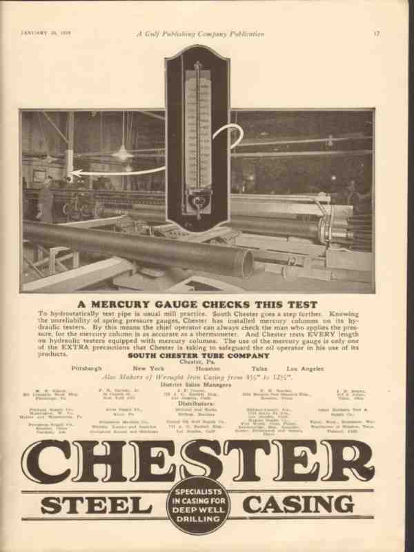 Original oil and gas trade magazine vintage ad for SOUTH CHEST TUBE COMPANY of Chester, PA. A Mercury Gauge Checks This Test. Every length of pipe tested on hydraulic testers equipped with mercury columns. Old 1928 petroleum industry oilfield and refinery advertisement.