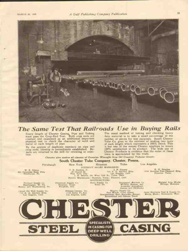 Original oil and gas trade magazine vintage ad for SOUTH CHESTER TUBE COMPANY of Chester, PA. The Same Test That Railroads Use in Buying Rails. Every length of Chester Casing, Pipe and Tubing must pass the Crop-End Test. Specialists in Casing for Deep Well Drilling. Old 1928 petroleum industry oilfield and refinery advertisement.
