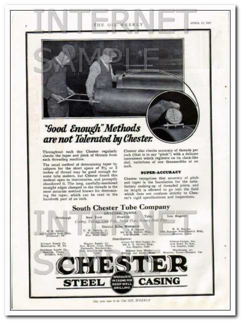 Original vintage oil and gas magazine ad for SOUTH CHESTER TUBE COMPANY of Chester, PA. Good Enough methods Are Not Tolerated by Chester. Chester checks accuracy of threads per inch with a delicate instrument which registers on its clock-like dial, variations of one thousandths of an inch. Chester Steel Casing, Specialists in Casing for Deep Well Drilling. Old dated 1927 petroleum industry oil well drilling equipment advertisement. Would display magnificently matted and framed!