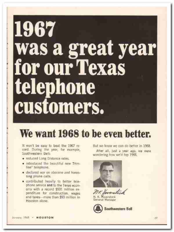 Original 1968 Houston business trade magazine vintage ad for SOUTHWESTERN BELL. 1967 was a great year for our Texas telephone customers. We want 1968 to be even better. Reduced long distance rates, introduced Trimline telephones, declared war on obscene and harassing phone calls. Contributed heavily to better telephone service and to the Texas economy with a record $531 million expenditure for construction, wages and taxes, more than $93 million in Houston alone. N. K. Hoverstock, General Manager. This old dated one page telephone magazine advertisement would display beautifully matted and framed.