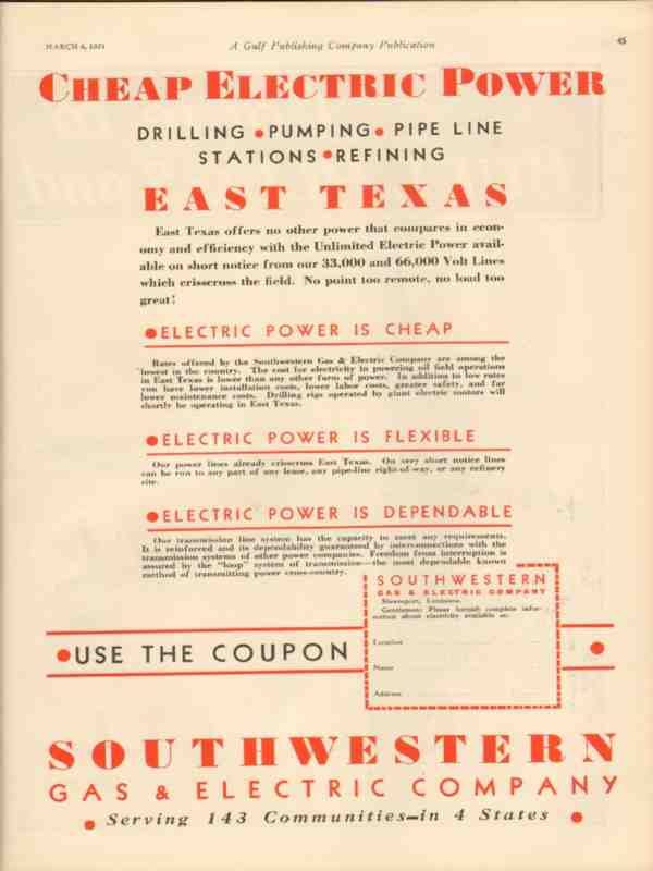 Original old oil and gas industry trade magazine vintage ad for SOUTHWESTERN GAS AND ELECTRIC COMPANY of Shreveport, LA. Cheap Electric Power for Drilling, Pumping, Pipe Line Stations, Refining in East Texas. This 1931 petroleum oil field magazine advertisement would display beautifully matted and framed.