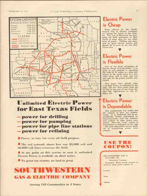 Original oil and gas trade magazine vintage ad for SOUTHWESTERN GAS & ELECTRIC COMPANY of Shreveport, LA. Unlimited Electric Power for East Texas Fields. Power for drilling, pumping, pipe line stations, and refining. This unique 1931 old petroleum oilfield power equipment magazine advertisement would display beautifully matted and framed.