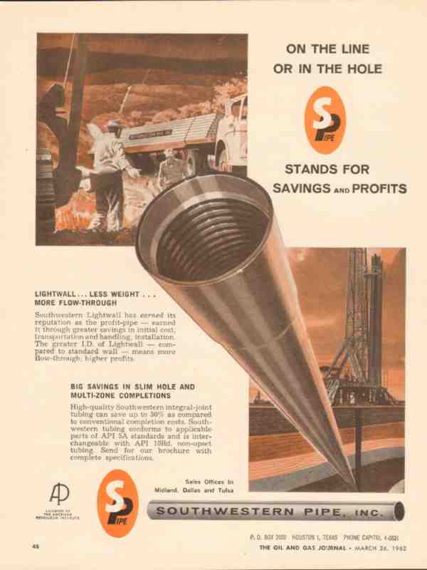 Original oil and gas trade magazine vintage ad for SOUTHWESTERN PIPE, INC. of Houston, TX. Lightwall Less Weight More Flow Through. Big Savings in Slim Hole and Multi Zone Completions. This unique 1962 old petroleum oilfield pipeline equipment magazine advertisement would display beautifully matted and framed.