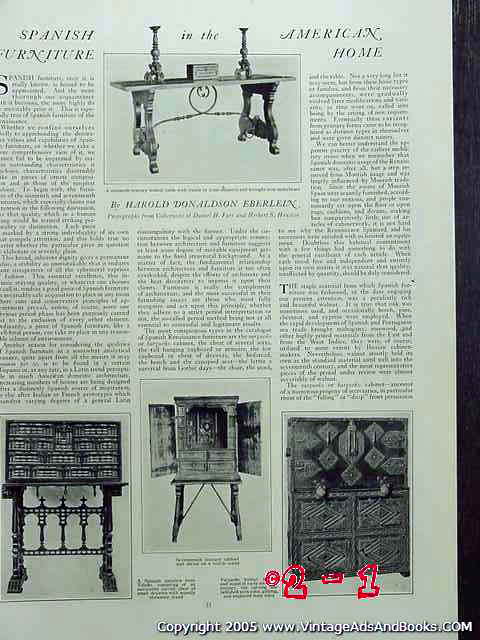 Original vintage magazine article, SPANISH FURNITURE in the AMERICAN HOME by Harold Donaldson Eberlein, Photographs from Collections of Daniel H. Farr and Herbert S. Houston. Pictured are: a Spanish papelera from Toledo; Seventeenth century cabinet and shrine on a trestle stand; Vargueno walnut cabinet and stand of early sixteenth century; Table of the late fifteenth century and high backed arm chair, both made of walnut; The long chest with lifting lid was a useful and frequent article of Spanish furniture; Sixteenth century walnut stand of vargueno cabinet; A small sixteenth century vargueno cabinet on high carved trestle stand, and two seventeenth century chairs with turned legs; A fifteenth century walnut chair and seventeenth century walnut table with turned legs and molded stretchers; Eighteenth century chairs with marquetry splats, reminiscent of Queen Anne fiddleback chairs; A seventeenth century walnut table with deep drawers, turned legs, and pear shaped drop handles; Model of an old time Spanish galleon with figures developed in leather. Old 1922 antique furniture magazine article. 2 pages.