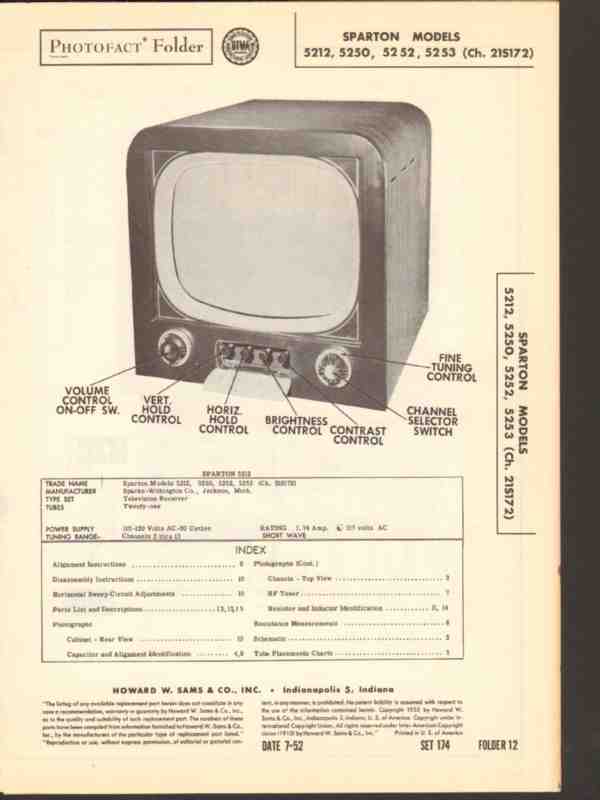 Vintage SPARTON models 5212, 5250, 5252 and 5253 (Ch. 21S172) 21 tube TV television receiver. Original old Sams Photofact manual includes schematic, layouts, alignment info, voltage & resistance test chart, repair parts list.16 pages. Dated 1952. Sparks-Withington Company of Jackson, MI. This manual would make a sensational accompaniment to your vintage video TV equipment.