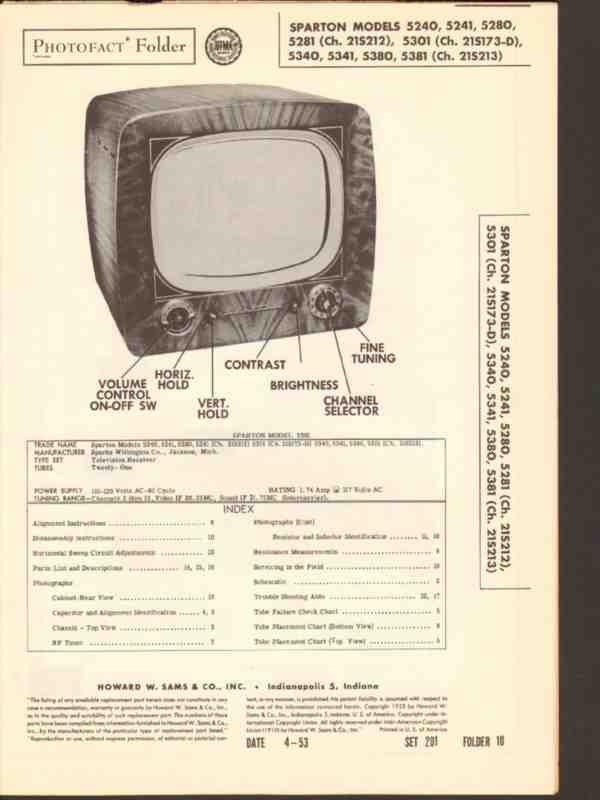 Vintage SPARTON models 5240, 5241, 5280, 5281 (Ch 21S212), 5301 (Ch. 21S173-D), 5340, 5341, 5380 and 5381 (Ch. 21S213) 21 tube TV television receiver. Original old Sams Photofact manual includes schematic, layout, alignment instructions, voltage & resistance test chart, repair parts list. 19 pages. Dated 1953. Sparks-Withington Company of Jackson, MI. This manual would make a sensational accompaniment to your classic video TV equipment.