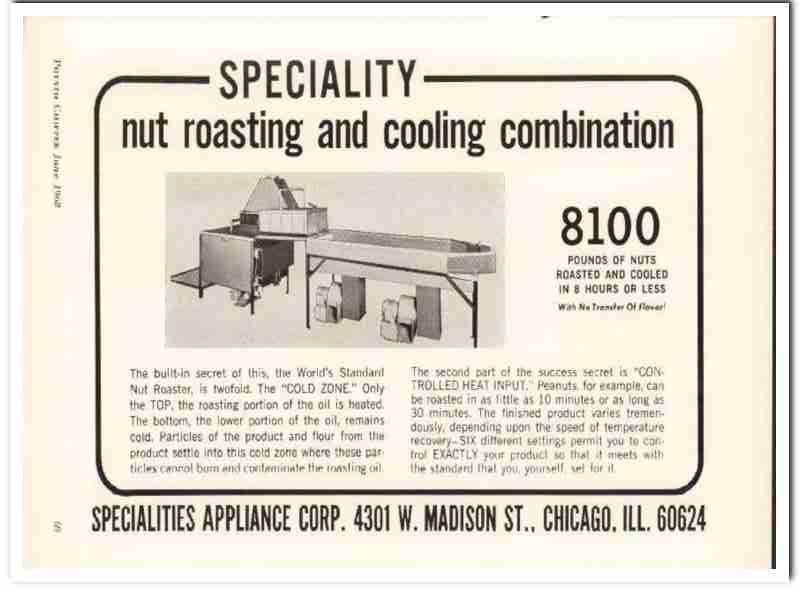 Original 1968 potato chip trade magazine vintage ad for SPECIALTIES APPLIANCE CORP. Main office and factory was located at 4301 West Madison Street, Chicago, IL. Specialty nut roasting and cooling combination. The built-in secret of this, the worlds Standard Nut Roaster, is twofold. The Cold Zone. Only the Top, the roasting portion of the oil is heated. The bottom, the lower portion of the oil is heated. The bottom, the lower portion of the oil, remains cold. Particles of the product and flour from the product settle into this cold zone where these particles cannot burn and contaminate the roasting oil. This old dated one page snack food manufacturing equipment advertisement would display beautifully matted and framed.