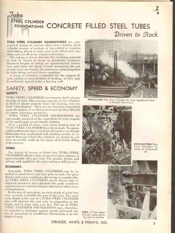 Foundations, Underpinning. Tuba Steel Cylinder Foundations, Concrete Filled Steel Tubes. Pictured are installing Tuba Steel Cylinders inside of building at American Baross Company of Hastings, NY. Tuba Steel Cylinders installed for Starrett Lehigh Building in New York City, NY. Pretesting spread footing beneath wall of Yankee Stadium, New York City, NY. National Bank of Commerce, New York City, NY. Pretest Foundation, American News Building New York City, NY. Excavation of cellar by means of electric shovels as steel is erected at Hudson Department Store, in Detroit, MI. and much more.