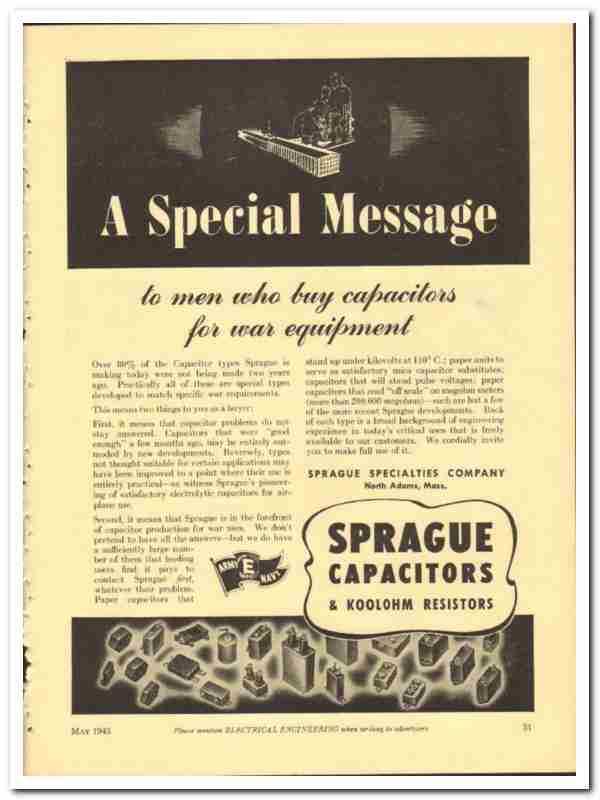 Original 1943 electrical trade vintage ad for SPRAGUE SPECIALTIES COMPANY. Main office and plant was located in North Adams, MA.