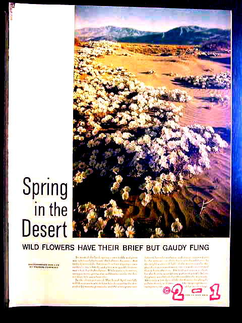 Original vintage multi page vintage magazine article, SPRING IN THE DESERT Wildflowers Have Their Brief But Gaudy Fling. In the American Southwest. Photographed by Life photographer Andreas Feiniger. Full Color Photographs of: White Primroses, Giant Saguaro Cactus, Silver Tipped Cholla Cacti, Yellow Encilias and Yellow Flowered Creosote Bush, Ocotillo, Beaver Tail Cacti, Yellow Encilias, Lavender Verbena Hedgehog, Barrel Cactus, Claret Cup Hedgehog, and a Coral Snake. Actual article looks much better than the low resolution photo. Old 1950 eight-page vintage floral article.