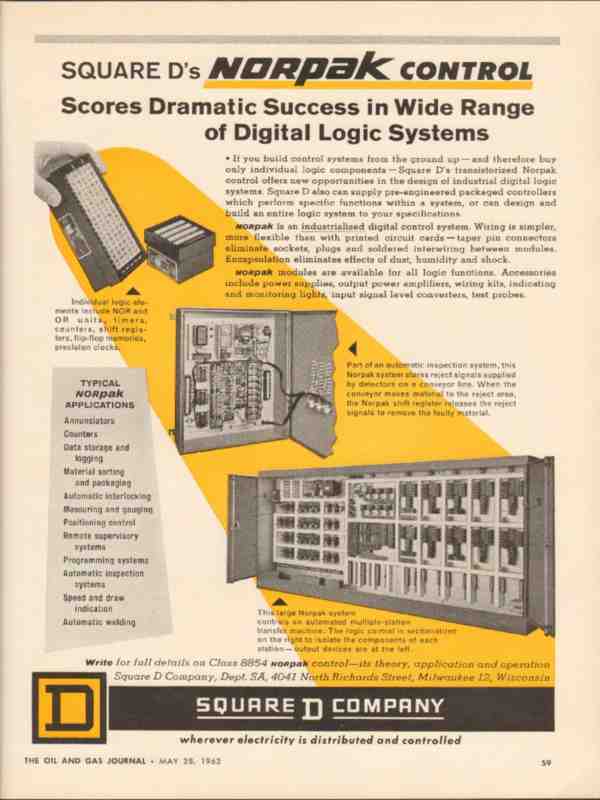 Original old electrical equipment industry trade magazine ad for SQUARED D COMPANY of Milwaukee, WI. Norpak Control Scores Dramatic Success in Wide Range of Digital Logic Systems. Communicators, counters, data storage and logging, measuring and gauging, programming systems. This 1962 equipment magazine advertisement would display beautifully matted and framed.