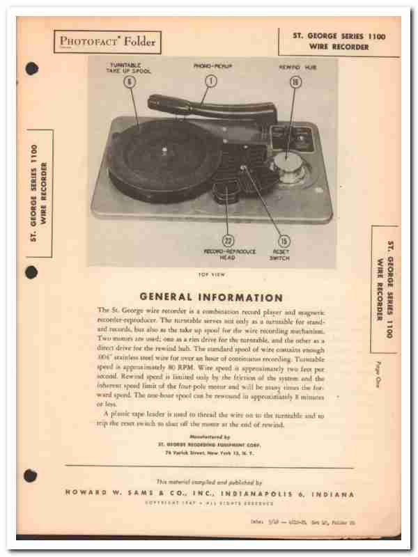 Vintage Phono Service Manual - ST. GEORGE model 1100 wire recorder combination phono phonograph record player. Manufactured by St. George Recording Equipment Corp., of New York, NY. Original old Sams Photofact manual includes: