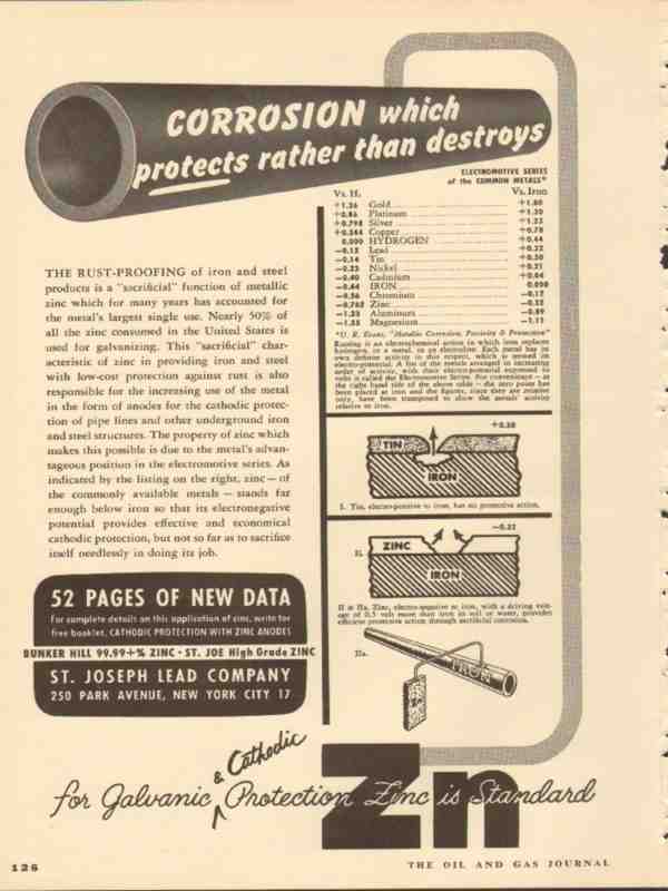 Original vintage oil and gas industry trade magazine ad for ST. JOSEPH LEAD COMPANY of New York City, NY. Corrosion which Protects Rather Than Destroys. Rust Proofing of Iron and Steel Products with Zinc. Old 1953 petroleum industry advertisement.