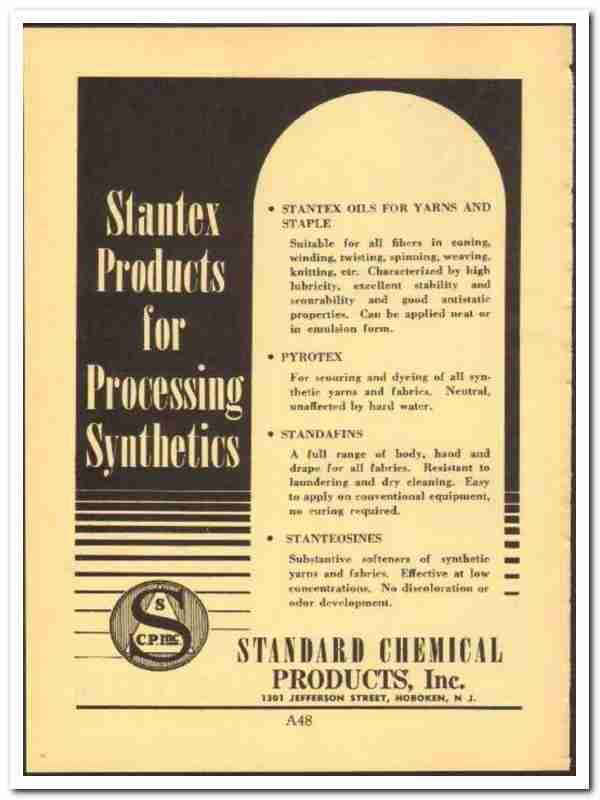 Original 1952 textile chemical trade vintage ad for STANDARD CHEMICAL PRODUCTS, INC. Main office and plant was located at 1301 Jefferson Street, Hoboken, NJ.