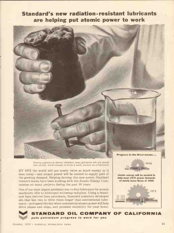 Original oil and gas trade magazine vintage ad for STANDARD OIL COMPANY of California. Radiation-Resistant Lubricants are helping put atomic power to work. Prediction by 1975 the world will use atomic energy. This unique 1956 old petroleum products industry lubrication magazine advertisement would display beautifully matted and framed.