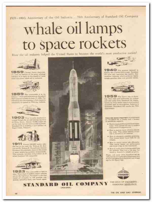 Original oil and gas trade magazine vintage ad for STANDARD OIL COMPANY of Indiana.  Whale Oil Lamps to Space Rockets, how the oil industry helped the United States to become the world's most productive nation. This unique 1959 old petroleum products refinery process magazine advertisement would display beautifully matted and framed.