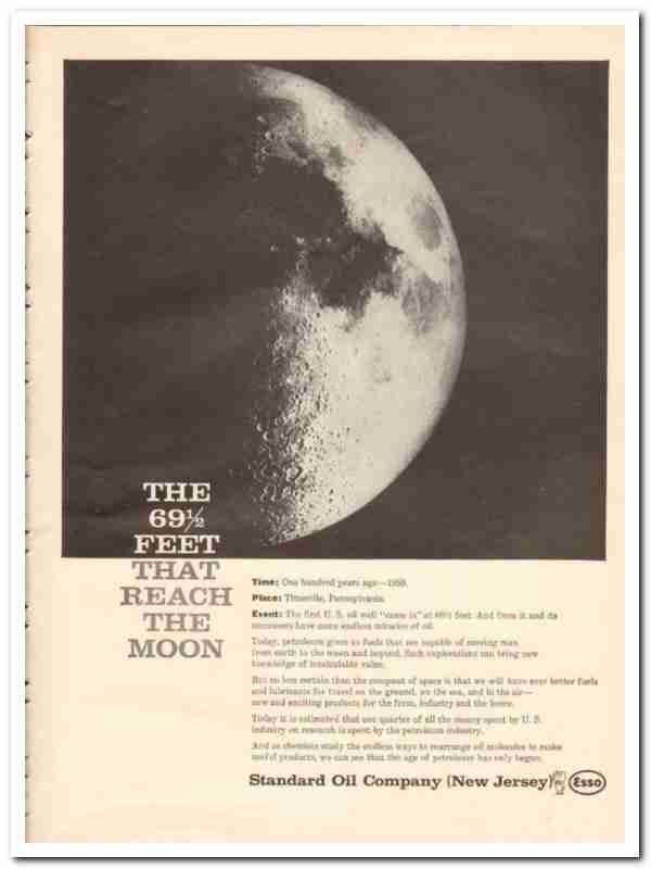 Original oil and gas trade magazine vintage ad for STANDARD OIL COMPANY (New Jersey). Esso, 69 Feet That Reach the Moon. Today, petroleum gives us fuels that are capable of moving man from earth to the moon and beyond. This unique 1959 old petroleum products refining process industry magazine advertisement would display beautifully matted and framed. 1-page advertisement.