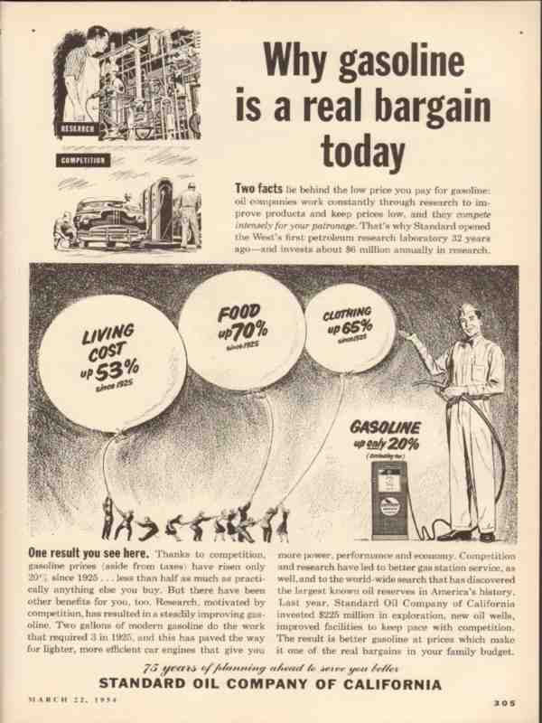 Original oil and gas trade magazine vintage ad for STANDARD OIL COMPANY OF CALIFORNIA. Why Gasoline is A Real Bargain Today. Oil companies work constantly through research to improve products and keep prices low. Unique 1954 old petroleum products refining and process gasoline industry magazine advertisement.