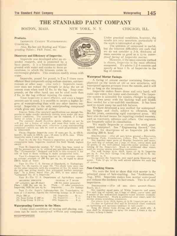Original paint trade vintage catalog for THE STANDARD PAINT COMPANY of Boston, MA., New York, NY and Chicago, IL. Manufacturers of Impervite cement waterproofing compound, waterproof concrete, mortar facings and non-cracking stucco. Disbound from a large 1916 engineering book, this unique one page technical specification brochure would display beautifully matted and framed. Contains a small amount of residual glue on edge.