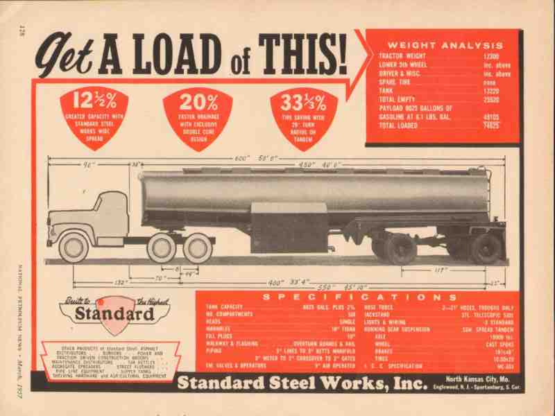 Original old petroleum transportation trade magazine vintage ad for STANDARD STEEL WORKS of Kansas City, MO. Get Load Faster, Drain, Greater Capacity. Tandem oil delivery. This unique 1957 truck trailer advertisement would display beautifully matted and framed.