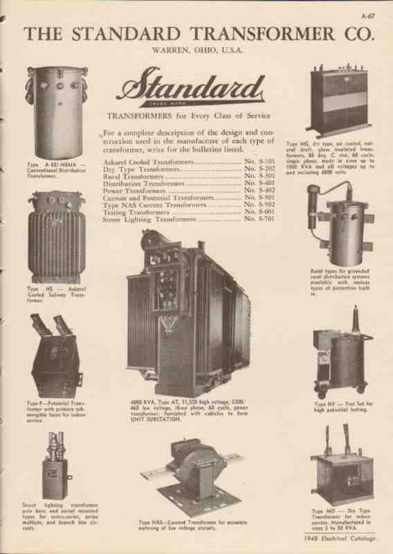 Original electrical trade vintage catalog for THE STANDARD TRANSFORMER COMPANY, was located in Warren, OH. Manufacturers of Askarel cooled subway, dry type, rural types, high voltage and street lighting transformers are shown. Disbound from a large 1948 electrical construction materials book, this unique old one page technical specifications brochure would display wonderfully matted and framed. A marvelous addition to your retro electric equipment library.