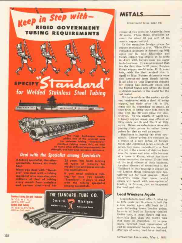 Original vintage automotive industries trade magazine ad for THE STANDARD TUBE COMPANY of Detroit, MI. Keep in Step with Rigid Government Tubing Requirements, Specify Standard for Welded Stainless Steel Tubing. Old 1953 metal industry advertisement.