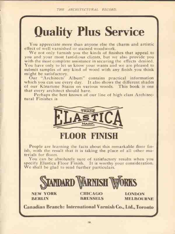 Original vintage architectural trade magazine ad for STANDARD VARNISH WORKS. Quality Plus Service. High Class Architectural Finish with Elastica Floor Finish. Old 1910 building construction and paint industry advertisement.