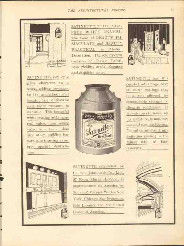 Original vintage architectural trade magazine ad for STANDARD VARNISH WORKS, New York City, NY. Satinette, the basis of Beauty Immaculate and Practical in Modern Decoration. Originated by Pinchin, Johnson and Company, LTD of London. Old 1912 building construction paint and varnish advertisement.