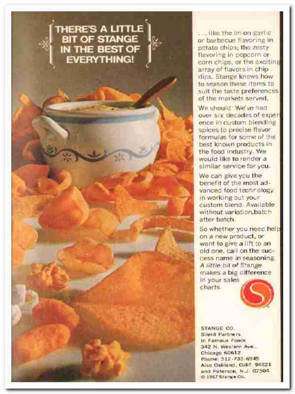 Original 1968 potato chip trade magazine vintage ad for the STANGE COMPANY. Main office and factory was located at 342 N. Western Avenue, Chicago, IL. Was also located in Oakland, CA and Paterson, NJ. There is a little bit of Stange in the best of everything, like the onion-garlic or barbecue flavoring in potato chips, the zesty flavoring in popcorn or corn chips, or the exciting array of flavors in chip dips. Stange knows how to season these items to suit the taste preferences of the markets served. This old dated one page snack food manufacturing advertisement would display beautifully matted and framed.
