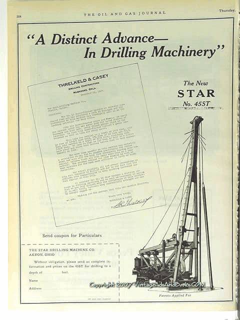 Original oil and gas trade magazine vintage ad for THE STAR DRILLING MACHINE COMPANY of Akron, OH. A Distinct Advance in Drilling Machinery. The New Star No. 45ST. Pictured is a letter from Threlkeld and Casey, Drilling Contractors in Muskogee, OK who used the 45 Star in drilling their oil well. Unique 1928 old petroleum oilfield drilling industry equipment magazine advertisement.