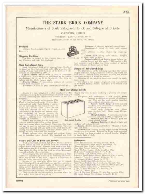 Original brick trade vintage catalog for THE STARK BRICK COMPANY. Main office was located in Canton, OH. Manufacturers of Salt-glazed brictile and bricks. Standard shapes and sizes are illustrated. This unique 1931 five page technical brochure would be a marvelous addition to your retro engineering design library. Pages are loose and contain small amount of residual glue on edge.