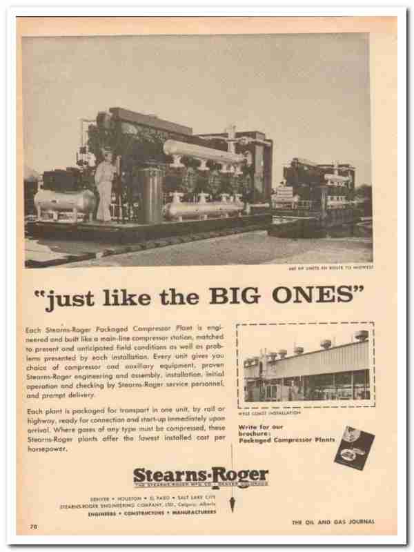 Original oil and gas trade magazine vintage ad for THE STEARNS-ROGER MANUFACTURING COMPANY. of Denver, CO. Big Packaged Compressor plant engineered and built like a main line compressor station. Packaged to transport in one unit, by rail or highway. This unique 1959 old compressed gas plant equipment magazine advertisement would display beautifully matted and framed.