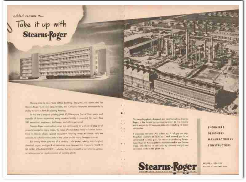 Original oil and gas trade magazine vintage ad for THE STEARNS-ROGER MANUFACTURING COMPANY. Main office and plant was located in Denver, Colorado. Branch Offices were located in Houston, TX., El Paso, TX., and Salt Lake City, UT. Moving into its new Home Office building, designed and constructed by Stearns-Roger to its own requirements, this Company improves substantially its ability to serve a fast-developing America. This unique 1955 old two-page gatefold petroleum refining industry and equipment magazine advertisement would display beautifully matted and framed.