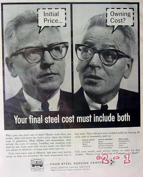 Original vintage magazine ad, STEEL SERVICE CENTER INSTITUTE of Cleveland, OH. Initial Price, Owning Cost? Your Final Steel Cost must Include Both. Old 1961 metal industry advertisement