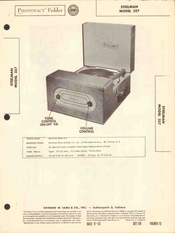 Vintage STEELMAN model 357 3-speed record player with 3 tube audio amplifier. Original old Sams Photofact manual includes schematic, layout, voltage & resistance test chart, repair parts list. 4 pages. Dated 1952. Steelman Phono and Radio Corp., of Mt. Vernon, NY. This manual would make a sensational accompaniment to your classic phono equipment.