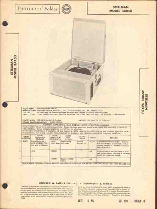 Vintage STEELMAN model 3AR5U 5 tube combination Superheterodyne AM radio receiver with 3-speed automatic record changer phonograph. Original old Sams Photofact manual includes schematic, layout, voltage & resistance test chart, repair parts list and description. 4 pages. Dated 1956. Steelman Phono and Radio Corp., of Mt. Vernon, NY. This manual would make a sensational accompaniment to your classic radio phono equipment.