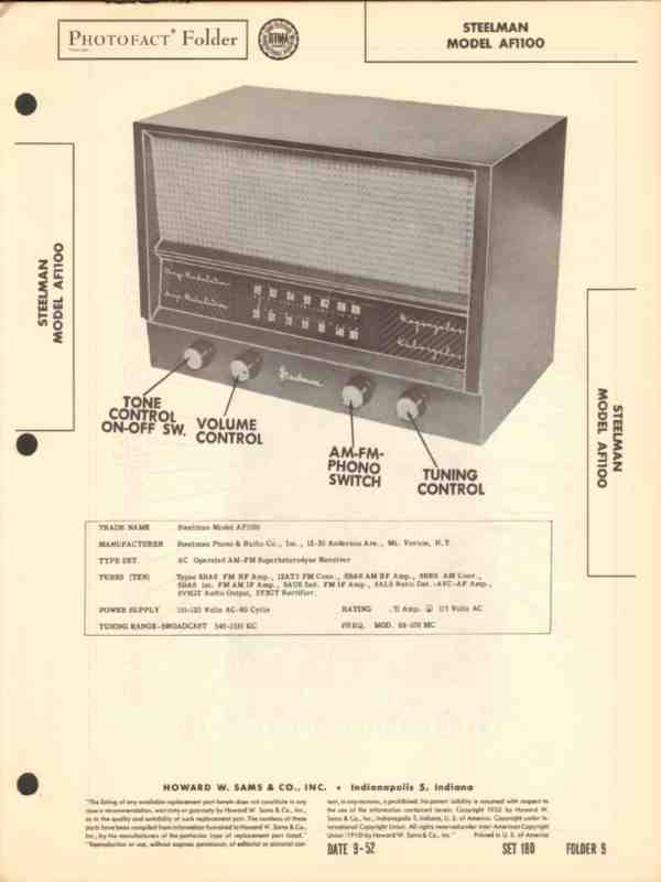 Vintage STEELMAN model AF1100 10 tube Superheterodyne AM FM radio receiver. Original old Sams Photofact manual includes schematic, layout, alignment instructions, voltage & resistance test chart, repair parts list. 8 pages. Dated 1952. Steelman Phono and Radio Corp., of Mt. Vernon, NY. This manual would make a sensational accompaniment to your classic radio equipment.