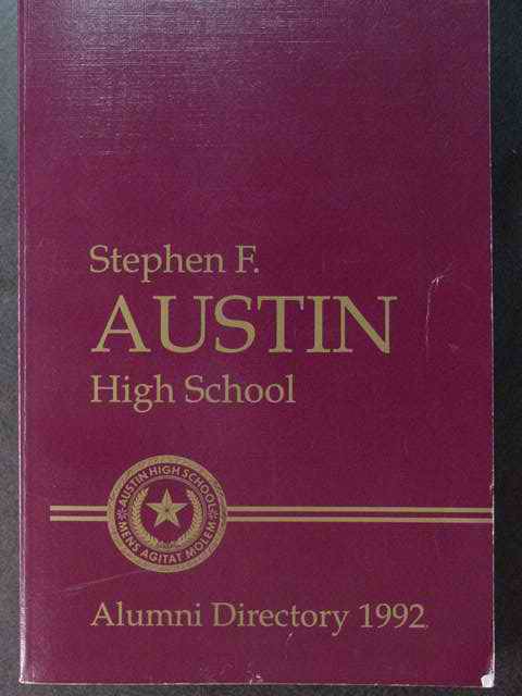 Soft covered book titled STEPHEN F. AUSTIN HIGH SCHOOL Alumni Directory, 1992 Houston, Texas, 389 pages.