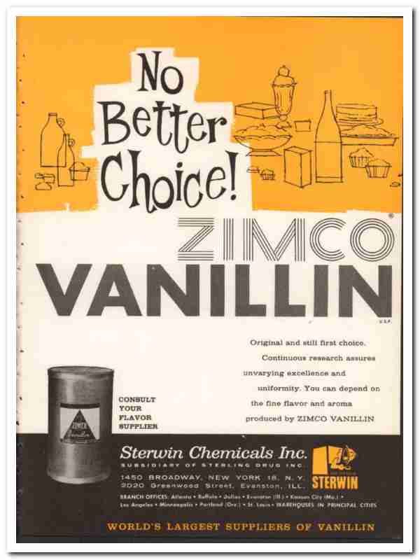 Original ice cream trade magazine vintage ad for STERWIN CHEMICALS, INC. (Subsidiary of Sterling Drug, Inc.) Main office was located at 1450 Broadway, New York, NY. Manufacturers of Zimco Vanillin flavor. No Better Choice! Continuous research assures unvarying excellence and uniformity. You can depend on the fine flavor and aroma. This unique 1959 old dairy industry magazine advertisement would display wonderful matted and framed. Nice graphics.
