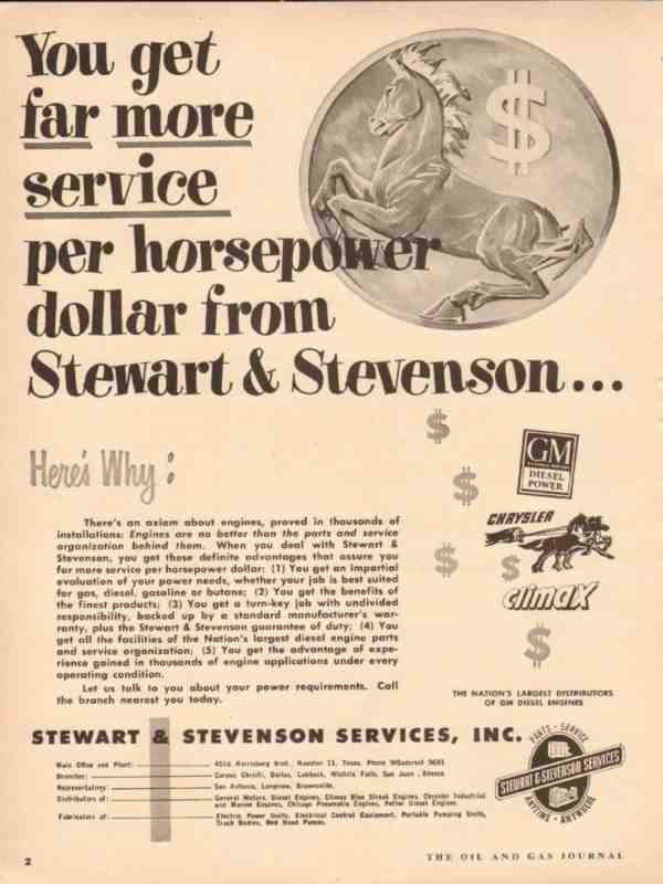 Original oil and gas trade magazine vintage ad for STEWART AND STEVENSON SERVICES, INC. of Houston, TX. More Service Per Horsepower Dollar from Stewart and Stevenson. The Nation's largest distributors of GM Diesel Engines. Old 1954 petroleum industry oilfield and refinery advertisement.