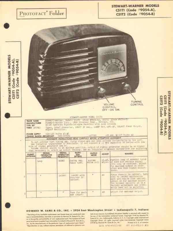 stewart-warner model c51t1 c51t2 5 tube am radio sams photofact manual