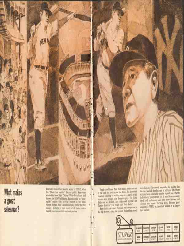 Original vintage broadcasting trade magazine ad for STORER BROADCASTING COMPANY. What Makes a Great Salesman? Baseball's darkest hour was the Black Sox Scandal. Experts credit George Herman Ruth's sensational play during 1921 with reviving interest in baseball. People loved to see Babe Ruth smash home runs out of the part and trot around the bases. The Great Babe was so idolized, fans nicknamed gigantic new Yankee Stadium The House that Ruth Built. Babe Ruth was a born showman who always rose to the big moment, going his greatest deeds when crowds were biggest. The Storer stations have remarkable popular appeal too. In New York, Storer's great salesman is WHN, an important station in an important market. Old 1965 2-page gatefold radio broadcasting industry advertisement.