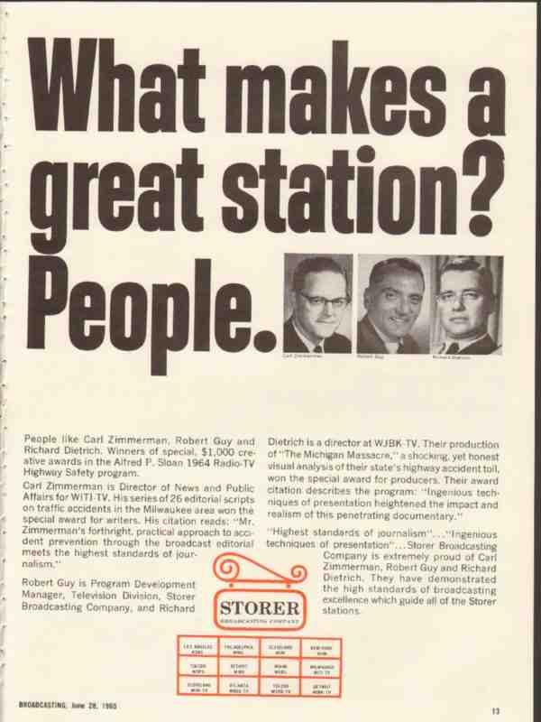 Original vintage broadcasting trade magazine ad for STORER BROADCASTING COMPANY. What Makes a Great Station? People like Carl Zimmerman, Director of News and Public Affairs for WITI TV, Robert Guy, Program Development Manager, Television Division, Storer Broadcasting Company, and Richard Dietrich director at WJBK TV. Winners of special creative awards in the Alfred P. Sloan 1964 Radio TV Highway Safety program. Old 1965 radio and television broadcasting industry advertisement.