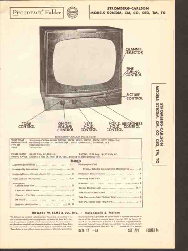 Vintage STROMBERG CARLSON model 521CDM, 521CM, 521CO, 521C5D, 521TM and 521TO 24 tube TV television receiver. Original old Sams Photofact manual includes schematic, layout, alignment instructions, voltage & resistance test chart, repair parts list. 20 pages. Dated 1953. This manual would make a sensational accompaniment to your classic video TV equipment.