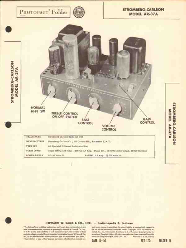 Vintage STROMBERG-CARLSON model AR-37A 5 tube 2 channel audio amplifier. Original old Sams Photofact manual includes schematic, layout, voltage & resistance test chart, repair parts list. 5 pages. Dated 1952.