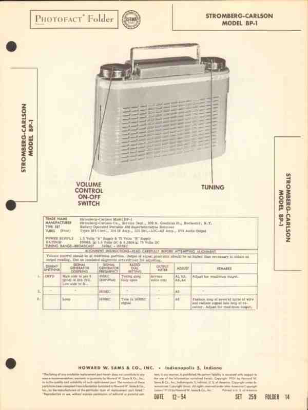 Vintage STROMBERG-CARLSON model BP-1 4 tube Superheterodyne AM radio receiver. Original old Sams Photofact manual includes schematic, layout, alignment instructions, voltage & resistance test chart, repair parts list and description. 4 pages. Dated 1954. This manual would make a sensational accompaniment to your classic radio equipment. Stromberg Carlson Company. of Rochester, NY. This manual would make a sensational accompaniment to your classic radio equipment.