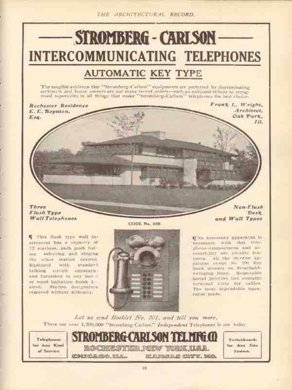 Original vintage architectural trade magazine ad for STROMBERG CARLSON TELEPHONE MANUFACTURING COMPANY of Rochester, NY. Rochester Residence of E. E. Boynton has the Stromberg Carlson Intercommunicating Telephones, Automatic Key Type. Frank L. Wright, Architect, of Oak Park, IL. Three Flush Type Wall Telephones, Code No. 956 is pictured. Old 1910 telephone industry advertisement.