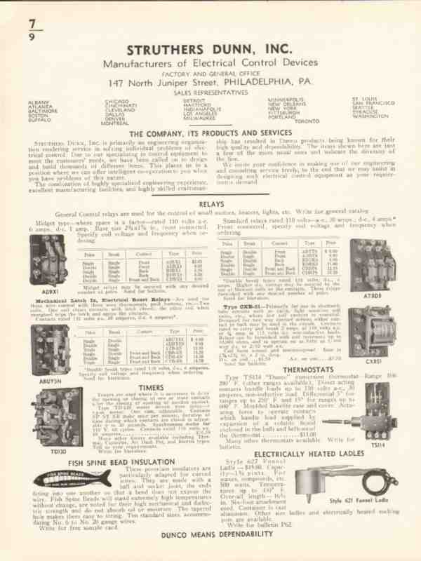 Original electrical trade vintage catalog for STRUTHERS DUNN, INC. was located at 147 North Juniper Street, Philadelphia, PA. Manufacturers of Electrical Control Devices, Relay, Timer, Thermostat and Fish Spine Bead Insulation. Disbound from a large 1936 electrical construction materials book, this unique old one page technical specifications brochure would display wonderfully matted and framed. A marvelous addition to your retro electric equipment library.