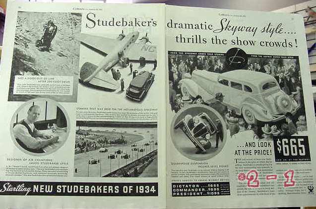 Original old car magazine vintage ad for STUDEBAKER. Studebaker's Dramatic Skyway Style Thrills the Show Crowds! Not a door out of line after 200 foot drop. Stamina that was bred on the Indianapolis Speedway. E.M. Laird Designer of Air Champions lauds Studebaker style.This 1934 Studebaker two-page gatefold automobile magazine advertisement would display beautifully matted and framed.